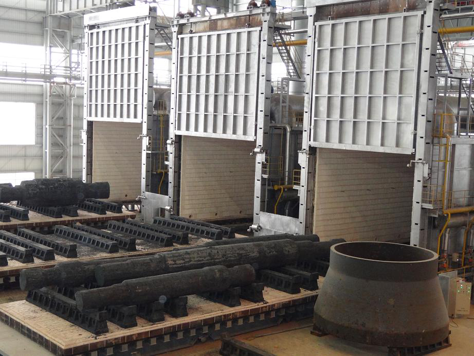 鋁合金淬火爐適用于對大、中型鋁合金產品零部件的固溶熱處理及時效處理,由加熱爐罩和移動式底架組成的。方形(或圓形)爐罩頂裝有起重機,通過鏈條和掛鉤可將料筐吊至爐膛。爐罩由型鋼支起,底部有氣動(或電動)操作的爐門。位于爐罩下方的底架可沿軌道移動、定位,底架上面載有淬火水槽和料筐等。